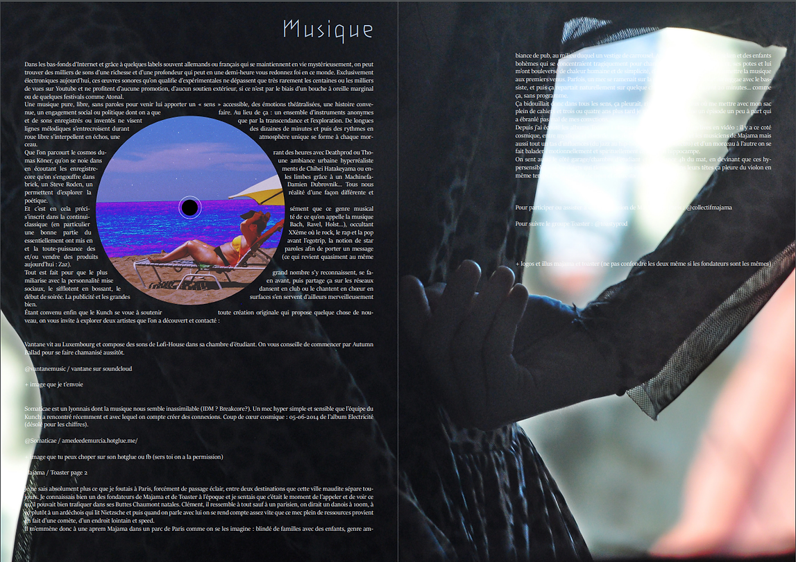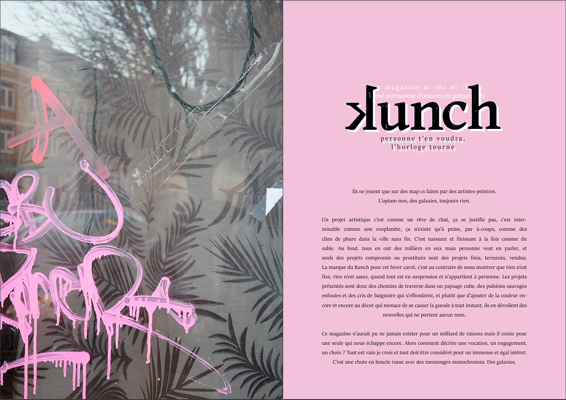Le Kunch est un projet de magazine que j’ai conçu en 2018 avec Alexandre Lebasnier et qui se donne pour vocation de publier des projets artistiques notamment collectifs et en cours de réalisation. Il s’ouvre à toute discipline artistique et toute démarche d’expression et de création.
